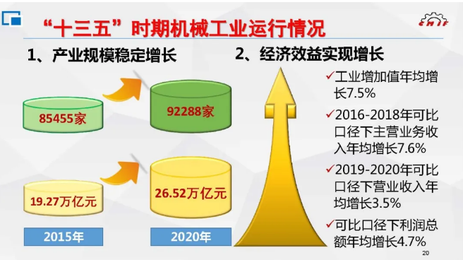 “十三五”期間,國民經濟各行各業都在追求高質量發展,無論是投資類產品還是消費類產品的需求都呈現出持續升級的趨勢,這在相當大的程度上對沖了傳統需求不足的壓力。同時,機械工業全行業都在為適應需求升級而努力加快創新步伐,特別是在風力發電、光伏發電等新能源設備、新能源汽車和工業機器人等新興產業領域取得了高速發展的業績,而且在機械企業自身生產過程和經營管理中大力推進以數字化、網絡化和智能化為主攻方向的技術改造,為今后的高質量發展積聚了后勁。